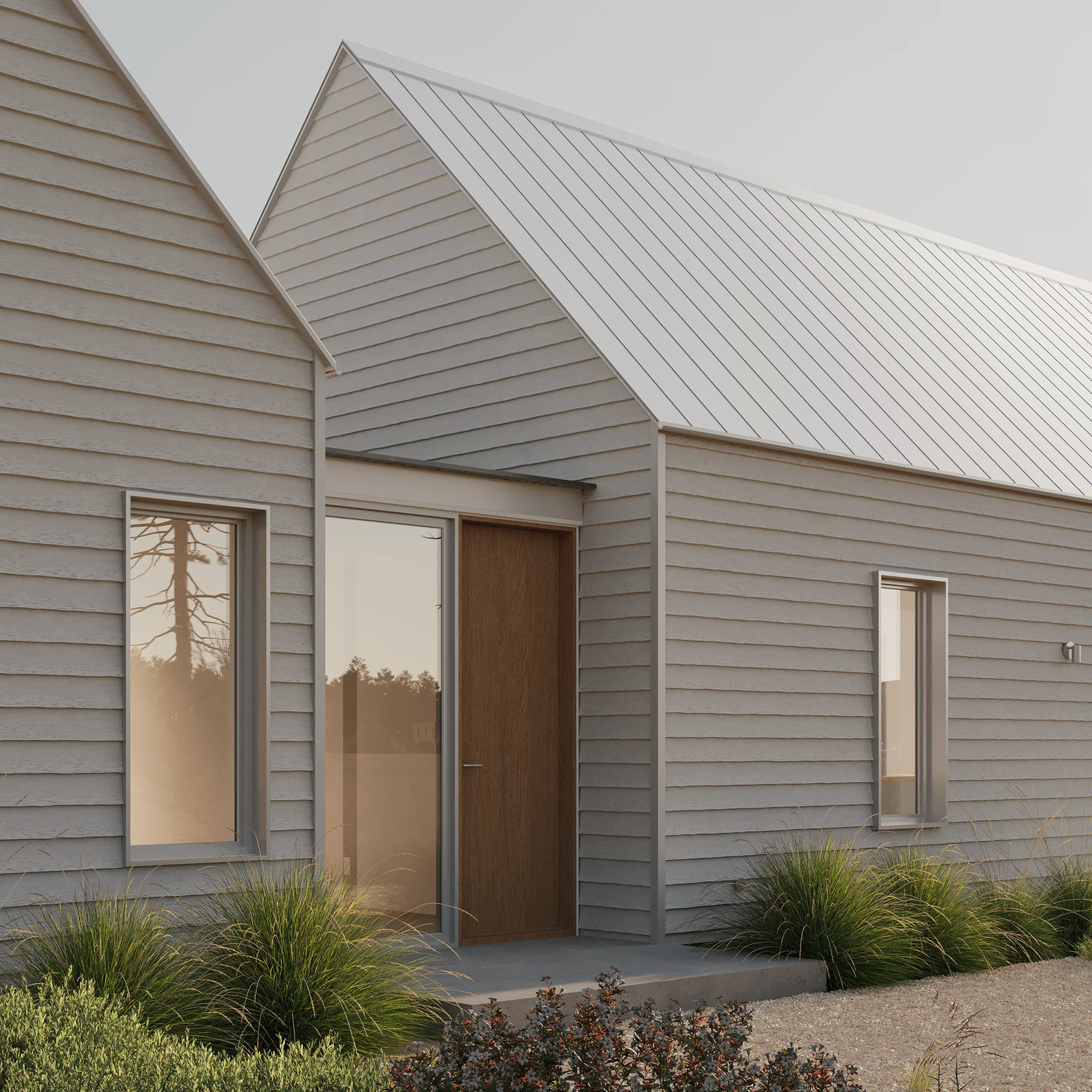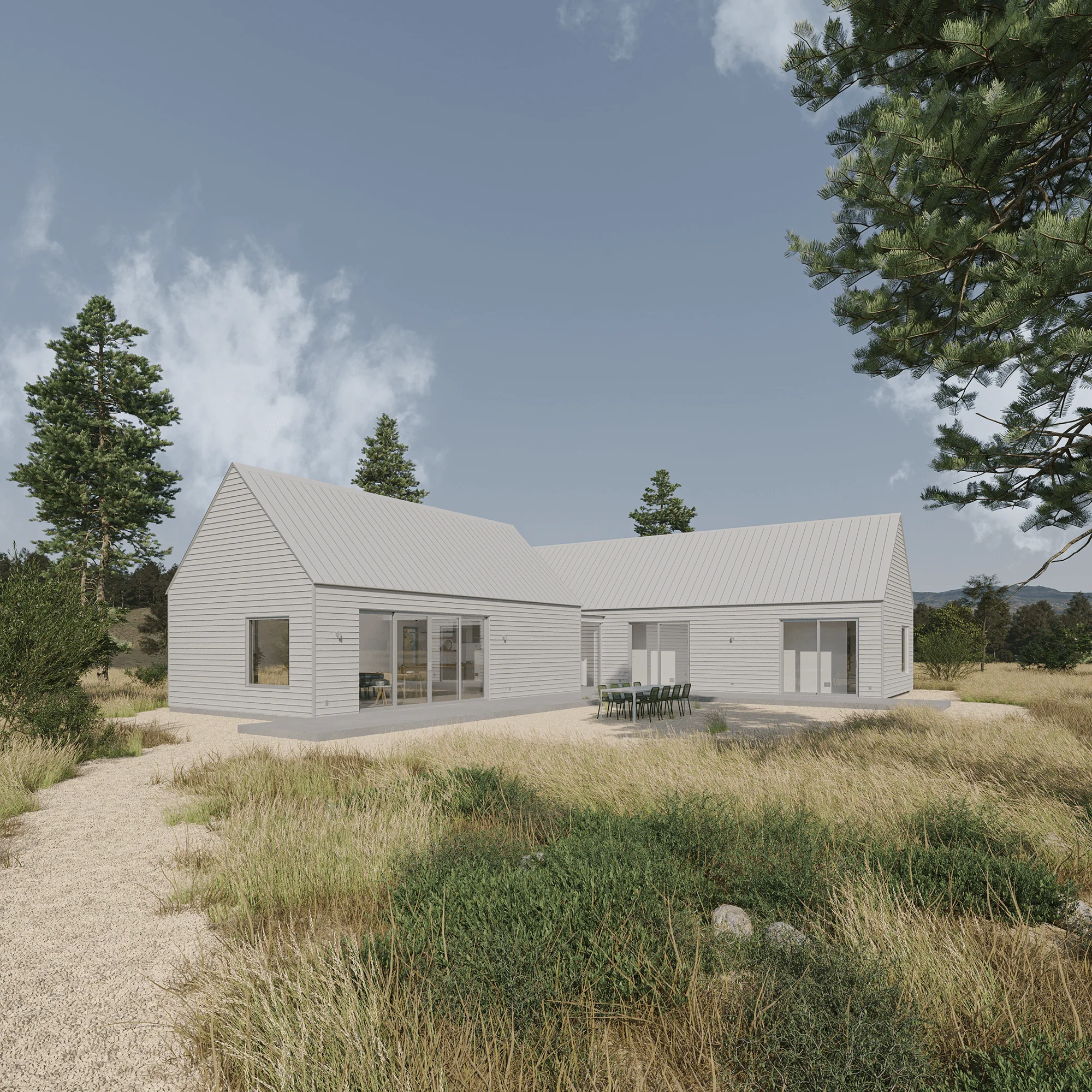 Discover the L Barnhouse, a groundbreaking home design that seamlessly blends modern living with flexibility. Its distinctive L-shaped plan centers around an inviting exterior court, promoting a harmonious indoor-outdoor lifestyle. The design features two simple gable geometries connected by a glazed entry, offering a contemporary aesthetic. Customization is at the heart of the L Barnhouse, with the DEN platform allowing for easy modifications to suit your unique needs, whether it's a different foundation, an expanded layout, or additional amenities like a pool or workshop. The generous kitchen opens into a vaulted dining and living space, bathed in natural light from full-height glass sliding doors. The home is designed for versatility, accommodating a 2 bedroom plus flex room or a 3 bedroom configuration, alongside a dedicated bedroom, bathroom, and laundry wing. Conditioned attics provide ample space for systems, equipment, and storage, ensuring a comfortable and organized living environment. Embrace the epitome of modern living in the L Barnhouse, where style meets functionality.
