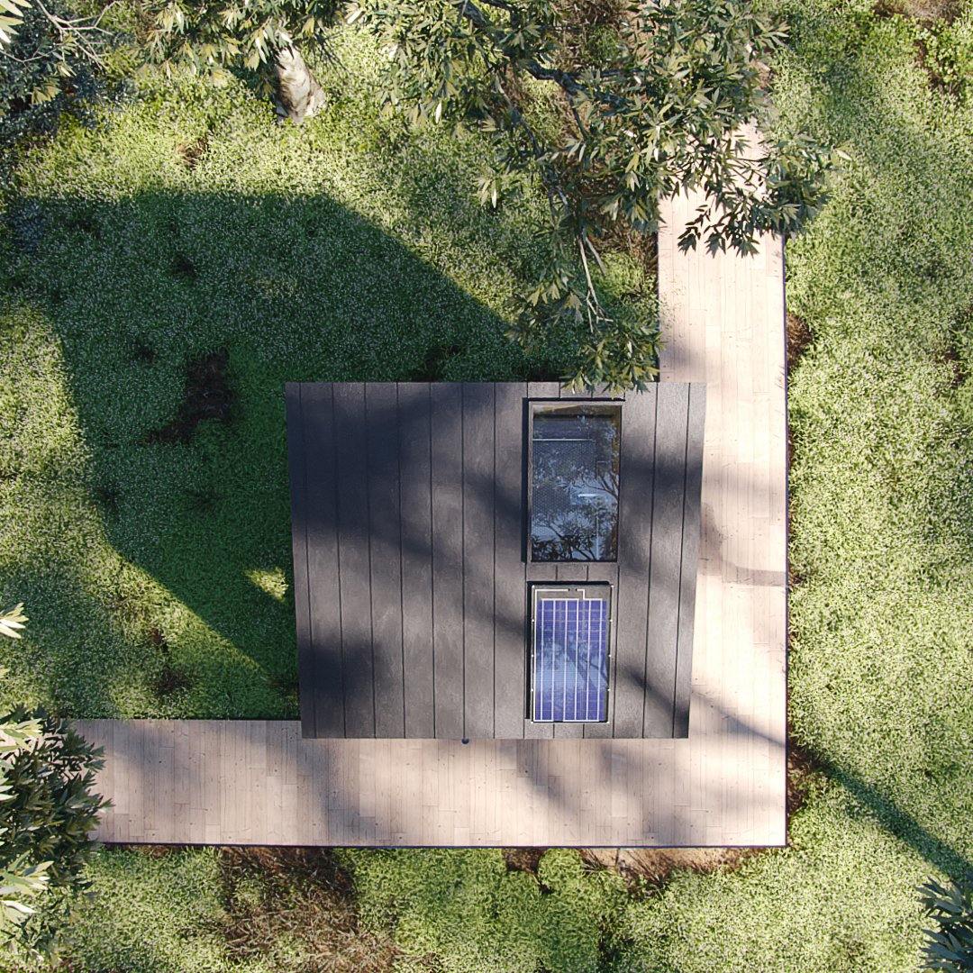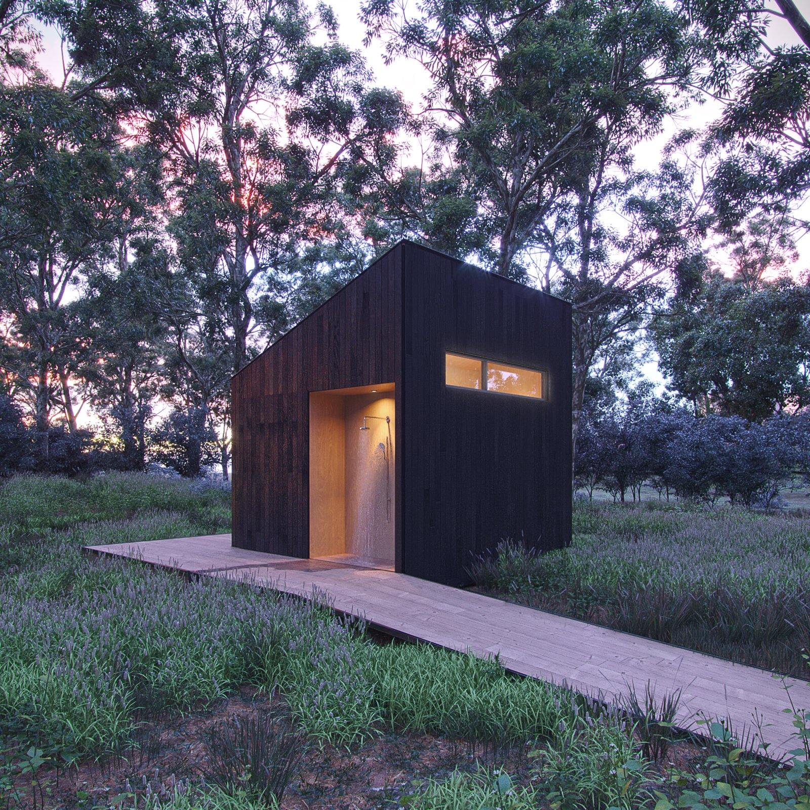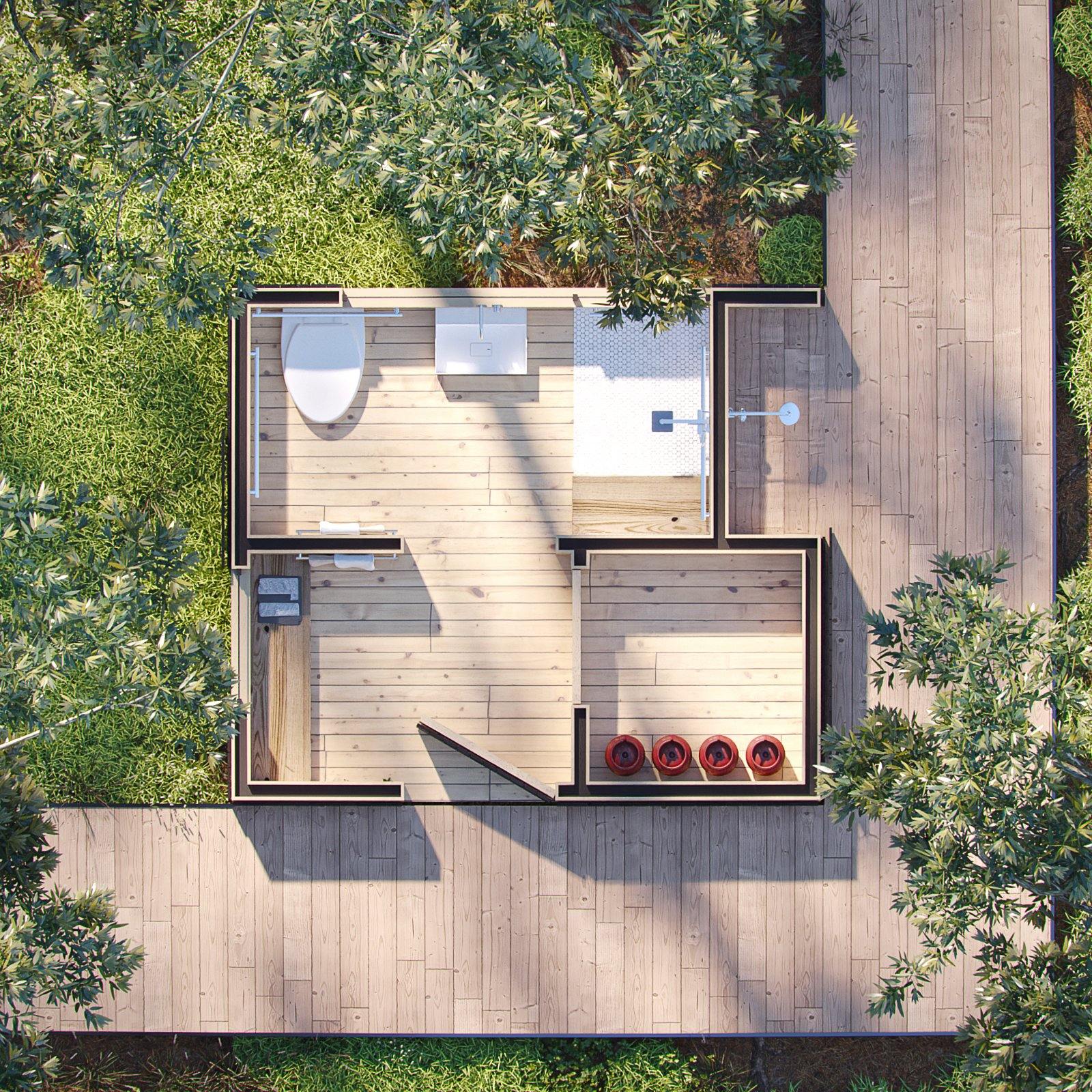 The Washroom is a beautiful, functional, architecturally superior outhouse to pair with our A-Frame Bunk Cabin. This modern outhouse plan accommodates multiple groups of people with two showers, a toilet, and a private changing room. Luxuriate in a shower outside among the trees, within an alcove that protects you from the elements and offers privacy to enjoy your outdoor bathing experience. Or, keep things inside with a spacious shower room complete with a bench for enjoying the views outside as you wash away the day. The entire building is ADA compliant and filled with open space and glass to let the outdoors in. Washing up in the woods is now a full sensory experience.