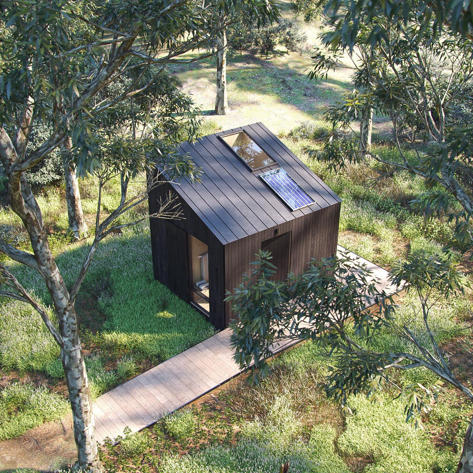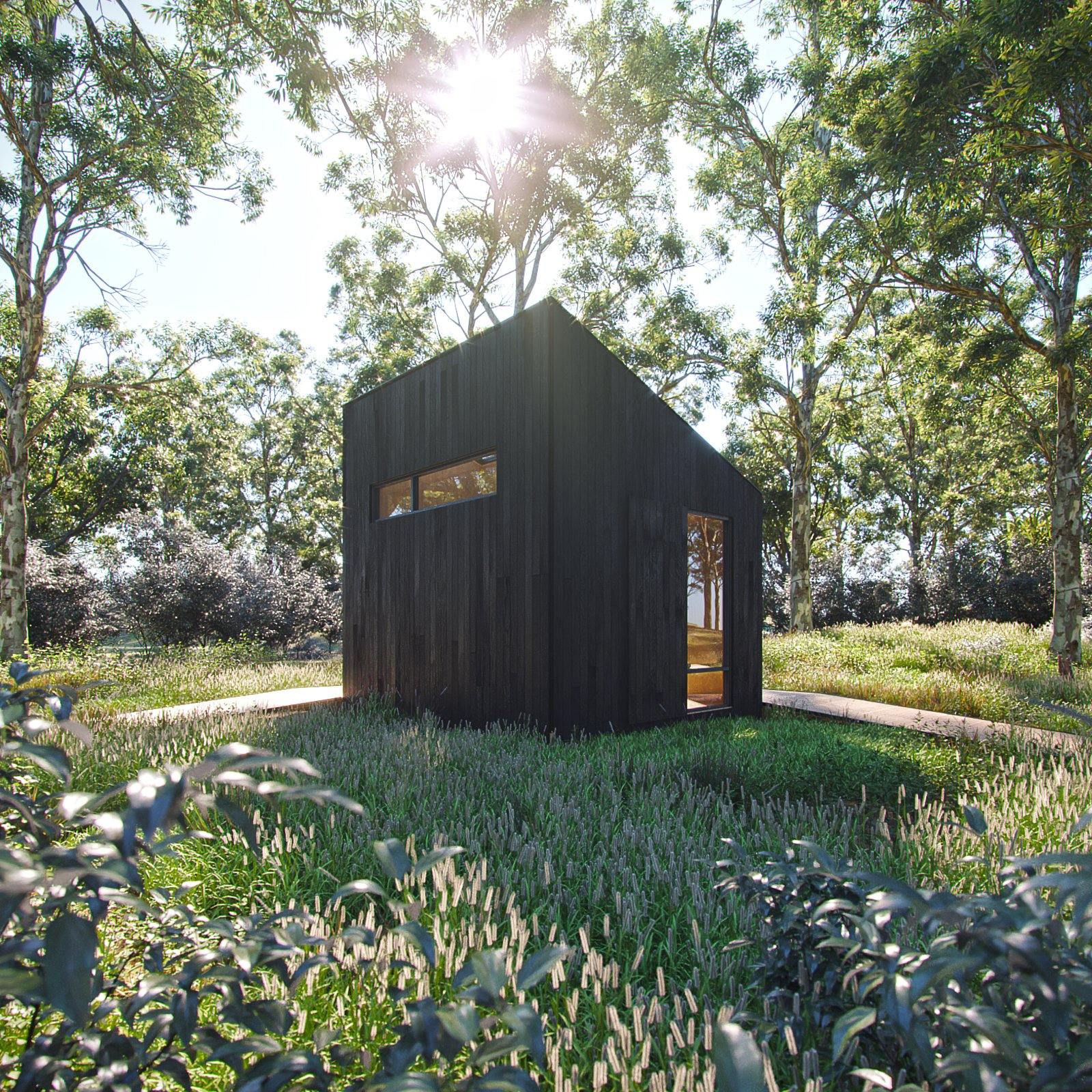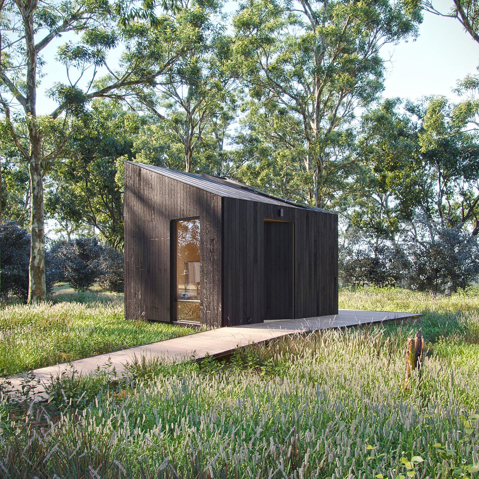 The Washroom is a beautiful, functional, architecturally superior outhouse to pair with our A-Frame Bunk Cabin. This modern outhouse plan accommodates multiple groups of people with two showers, a toilet, and a private changing room. Luxuriate in a shower outside among the trees, within an alcove that protects you from the elements and offers privacy to enjoy your outdoor bathing experience. Or, keep things inside with a spacious shower room complete with a bench for enjoying the views outside as you wash away the day. The entire building is ADA compliant and filled with open space and glass to let the outdoors in. Washing up in the woods is now a full sensory experience.