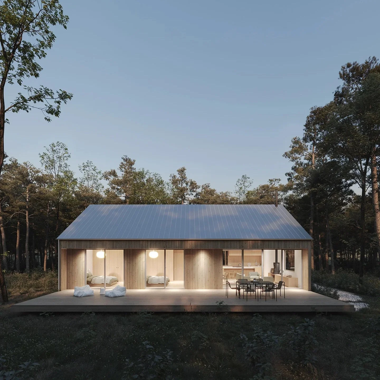 Discover the charm of modern living with our 2 bedroom, 2 bath Scandinavian farmhouse, boasting 1300 square feet of thoughtfully designed space. This single-floor home comfortably sleeps 4 to 6 people, making it perfect for families or small groups. Vaulted ceilings and an open, airy communal area create a sense of spaciousness, while the deck running the length of the backside invites you to enjoy the beauty of the outdoors. The simplicity of this single-floor design caters to a variety of family styles, offering ease and comfort for all. An additional office space provides a quiet retreat for focused work or relaxation, whether you're at a computer or on a yoga mat. Natural light pours in through DEN's signature windows and doors, blending the interior with the natural surroundings and creating a seamless indoor-outdoor living experience. Embrace the elegance and functionality of this modern Scandinavian farmhouse, where every detail is crafted for a serene and stylish lifestyle.