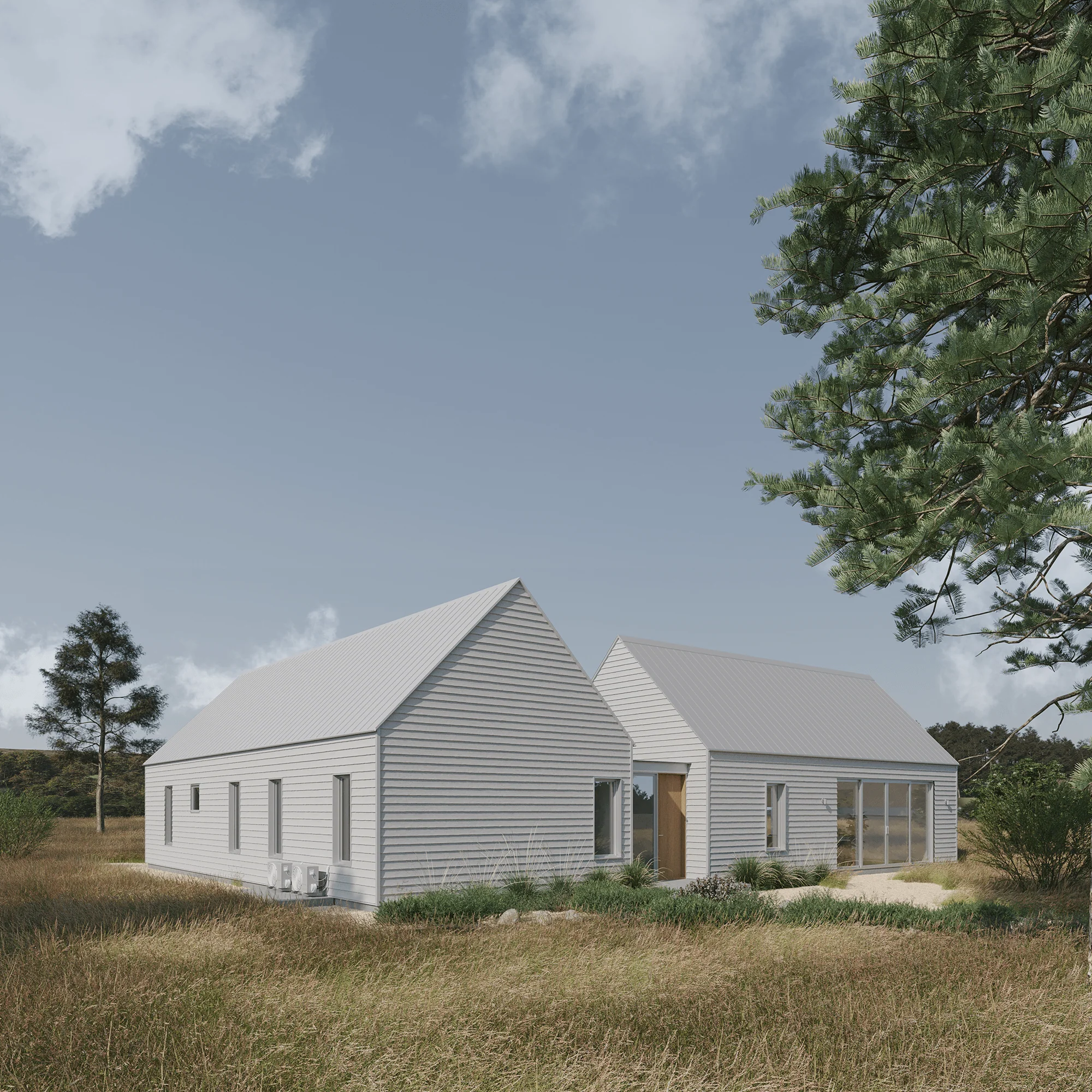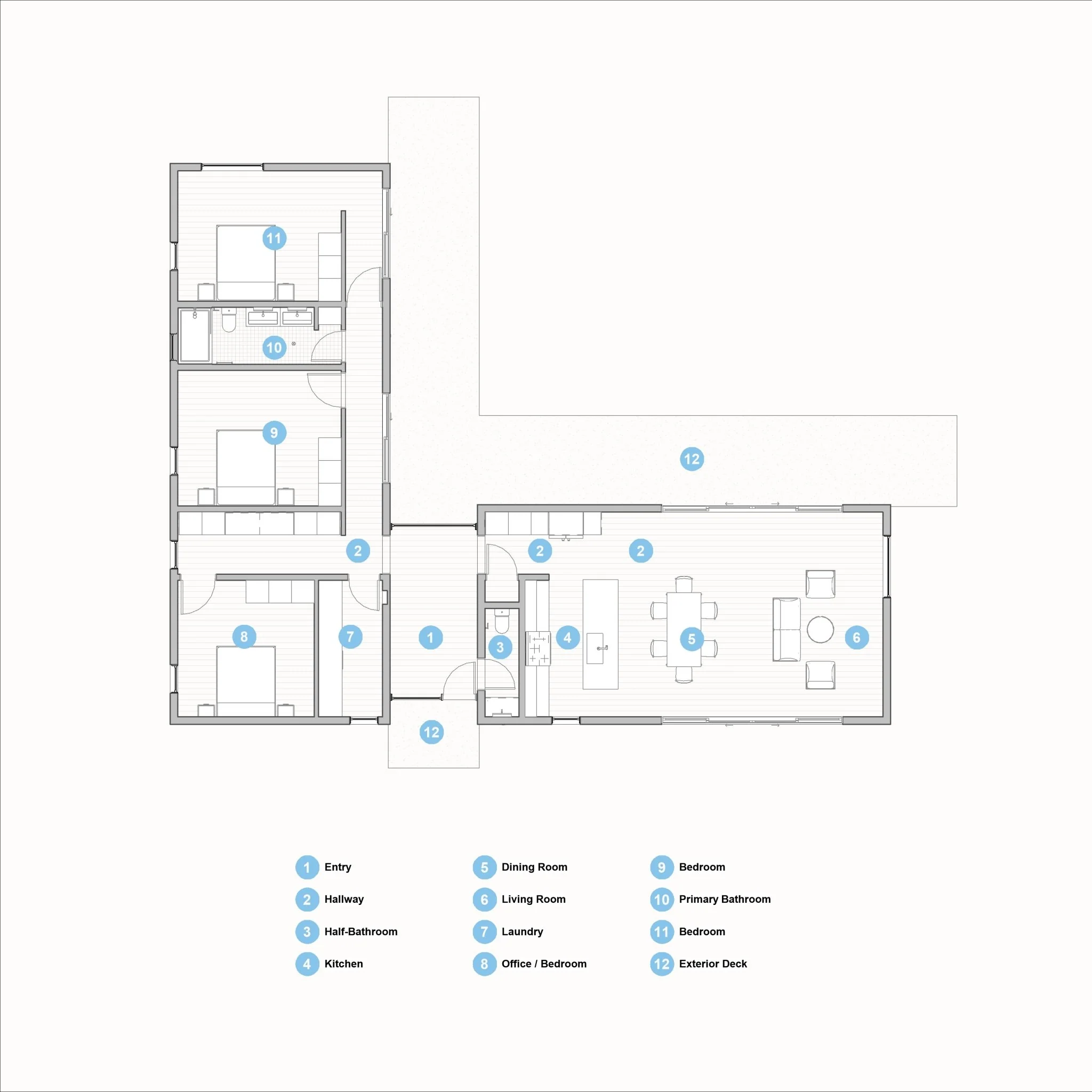 Discover the L Barnhouse, a groundbreaking home design that seamlessly blends modern living with flexibility. Its distinctive L-shaped plan centers around an inviting exterior court, promoting a harmonious indoor-outdoor lifestyle. The design features two simple gable geometries connected by a glazed entry, offering a contemporary aesthetic. Customization is at the heart of the L Barnhouse, with the DEN platform allowing for easy modifications to suit your unique needs, whether it's a different foundation, an expanded layout, or additional amenities like a pool or workshop. The generous kitchen opens into a vaulted dining and living space, bathed in natural light from full-height glass sliding doors. The home is designed for versatility, accommodating a 2 bedroom plus flex room or a 3 bedroom configuration, alongside a dedicated bedroom, bathroom, and laundry wing. Conditioned attics provide ample space for systems, equipment, and storage, ensuring a comfortable and organized living environment. Embrace the epitome of modern living in the L Barnhouse, where style meets functionality.