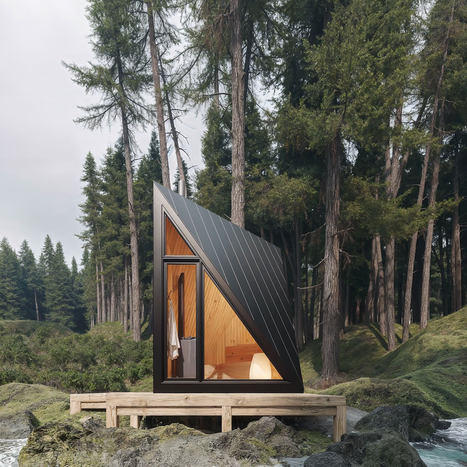 Striking, spacious, and unlike anything else, the Prism Sauna transforms the traditional sauna into a geometric statement piece. Designed for 4 people, its sculptural asymmetrical form captures light and shadow from every angle—turning a simple wellness ritual into an immersive experience. The sharply sloped roofline and faceted silhouette create a compact yet dramatic retreat that assembles in just a few days. Choose from a fully glazed front, a partial window, or a solid wall to tailor privacy and performance to your setting. Compatible with both electric and wood-burning stoves, it delivers authentic heat within a futuristic shell. Offered exclusively as the Sweaty Package, the Prism includes the complete DIY sauna plan for a refined, ready-to-build experience. Iconic, efficient, and built to endure—the Prism Sauna redefines modern heat therapy.